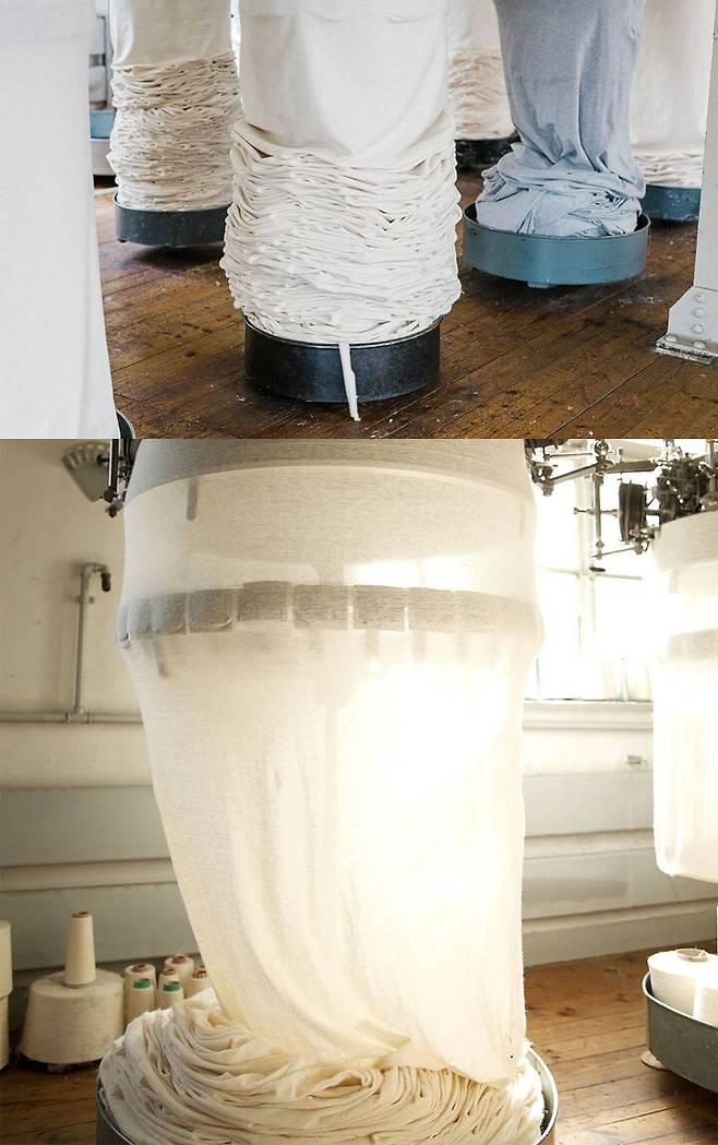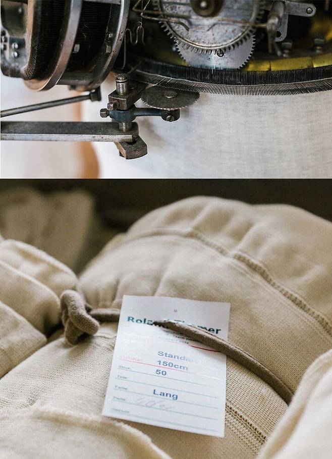 메르츠 비 슈바넨의 가장 큰 특징은 루프 휠러로 작업한다는 점이다. 루프 휠러는 천 개가 넘는 바늘이 마치 뜨개질을 하듯 위아래로 움직이고, 동시에 느리게 회전하면서 옷감을 짜는 기계를 말한다. 이렇게 완성된 직물이 오늘날 ‘저지’라고 알려진 빈티지한 느낌의 면이다. 원통을 그리며 둥글게 회전하며 옷감을 만들었기 메르츠 비 슈바넨 의류의 양 옆구리에는 봉제선이 없다. 또한 소매와 몸통은 삼각 커팅 기법을 사용해 연결했기 때문에 겨드랑이와 같은 이음새 부분이 인체공학적으로 설계되어 있다. 메르츠 비 슈바넨의 셔츠가 착용감이 유독 편안한 이유는 이 때문이다.