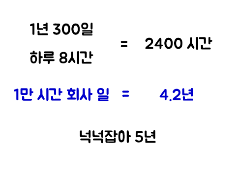 일년에 300일을 출근을 하고 하루 8시간을 일한다고 하면 일년에 2400 시간이다. 그렇다면 약 4년을 조금 넘게 되면 우리는 회사에서 한 업무를 1만 시간을 하게 된다.