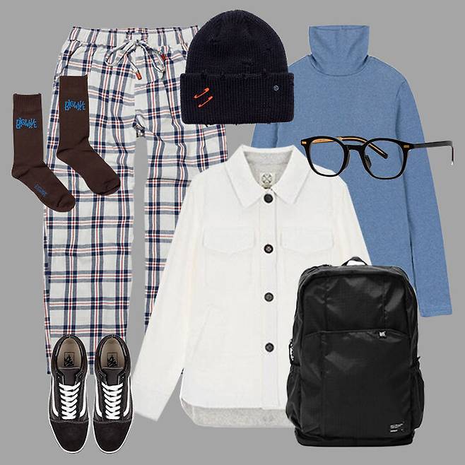 백팩, 안경 코디에 비니까지 써주면