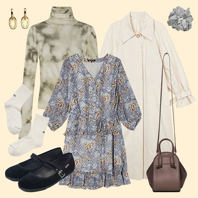 트렌치코트와 플로럴 원피스를