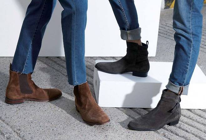 (왼쪽부터) 커팅 데님 팬츠 5만 9천 9백원 에잇세컨즈, 갈색 스웨이드 첼시 부츠 37만 8천원 로크 제품. 워싱 데님 팬츠 4만 9천원 자라, 스트랩 장식을 한 첼시 부츠 가격미정 올세인츠 제품.