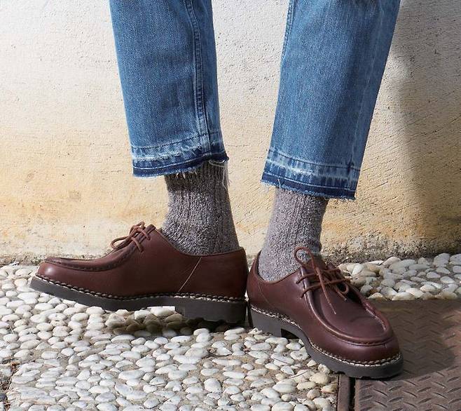 밑단을 커팅한 데님 팬츠 8만 9천원 자라, 송아지 가죽 로퍼 52만 9천원 파라부트 by 유니페어.