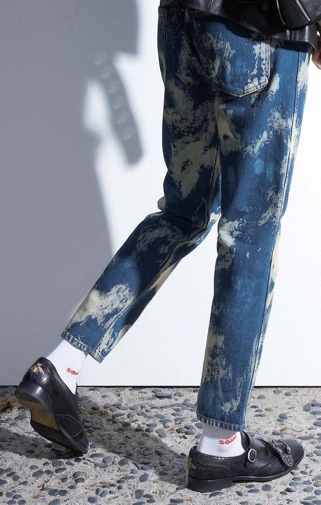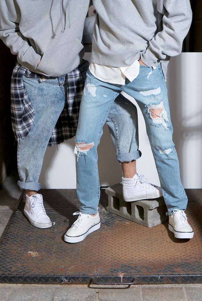 (왼쪽부터) 복고풍 아이스 데님 팬츠 39만 5천원 시스템 옴므, 흰색 하이톱 운동화 6만 9천원 반스 제품. 디스트로이드 진 4만 9천원 H&M, 소가죽 소재 흰색 스니커즈 14만 8천원 플락 제품.