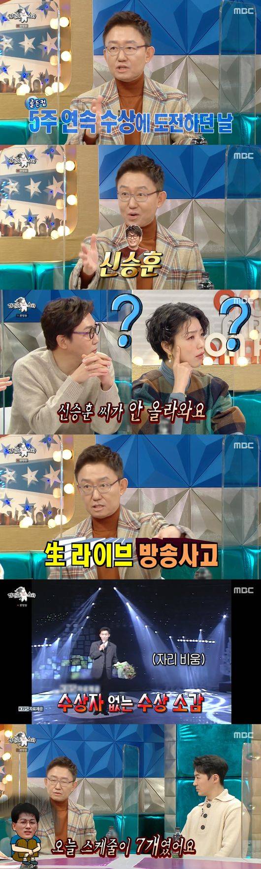 이어 손범수는 "신승훈씨가 1위었는데 안 올라 오더라. 그래서 신승훈씨가 올 동안 계속 얘기를 했다. 발이 보이길래 온 줄 알았는데 신승훈씨를 찾으러 간 FD의 발이었다"라고 말했다.