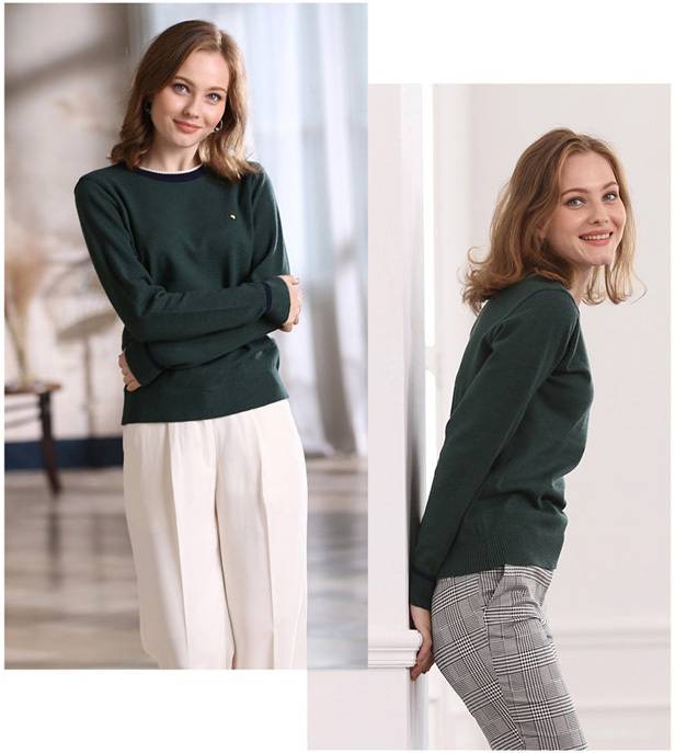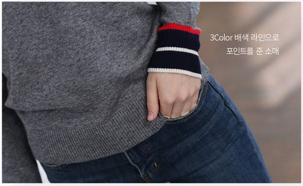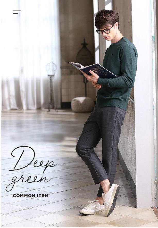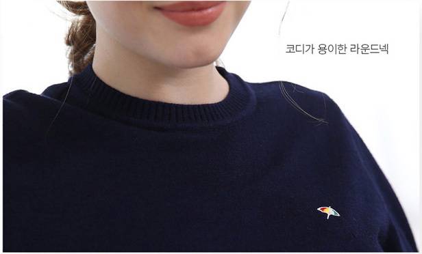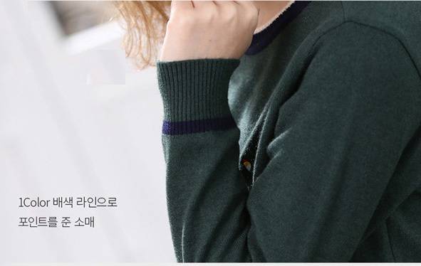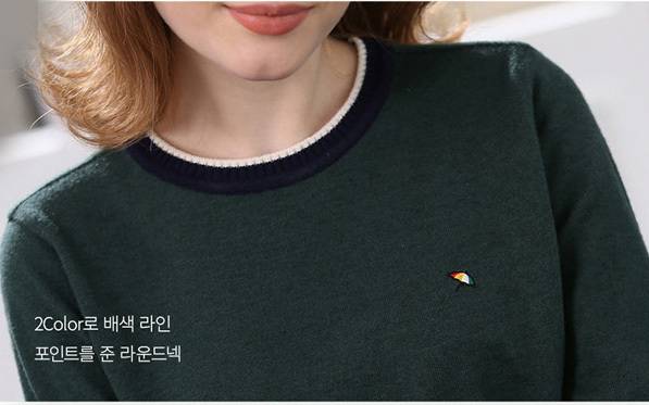 톤다운된 그린 컬러에 라운넥과 팔목부분의 배색포인트를 주어, 꾸민듯 안꾸민듯 편하고 멋스럽게
