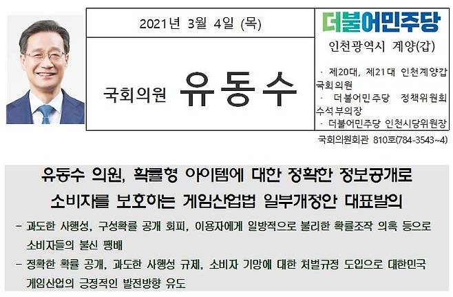 유동수 더불어민주당 의원은 지난 5일 '컴플리트 가챠' 금지가 포함된 '게임산업진흥에 관한 법률 일부개정안(게임법 개정안)'을 대표 발의했다. 개정안에는 확률형 아이템에 대한 정보 공개뿐만 아니라 '컴플리트 가챠' 상품 판매 금지 내용도 담겨 있다.