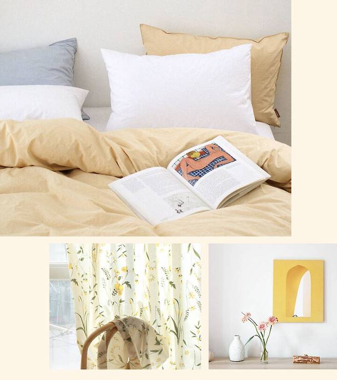 (좌) 산뜻한 노란 꽃이 포인트인 광목 커튼, 1만원대