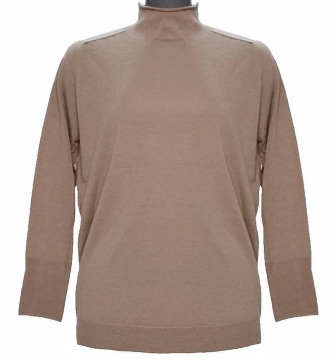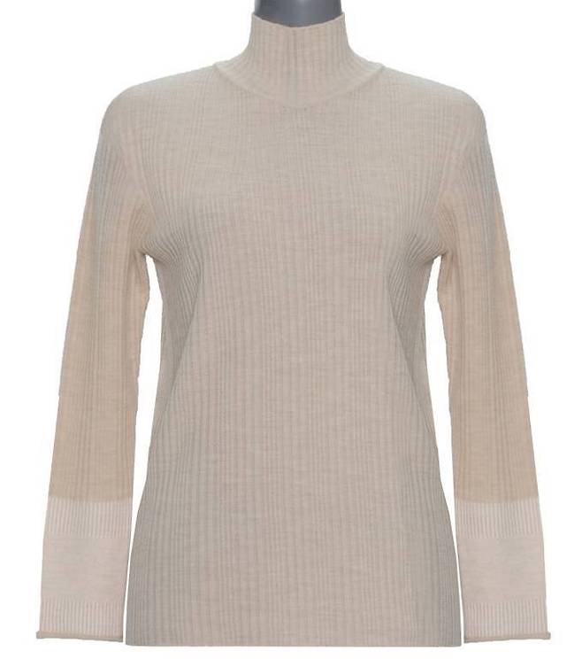 불규칙한 립조직을 섬세하게 넣은 모크넥 아이템으로 소매단에 조직변형 배색으로 포인트를 주었다. 이태리 혼방사를 사용해 고급스러워 보이며 골지 조직으로 착용감이 우수하다.