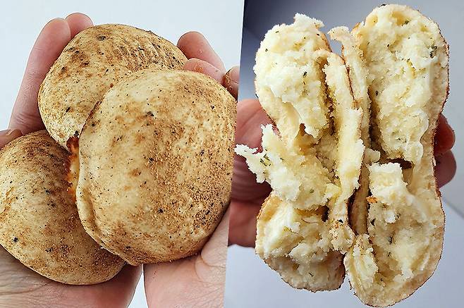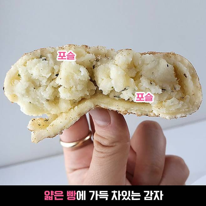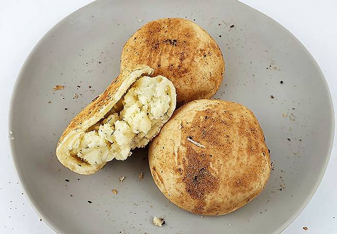 안에 감자소는 그냥 으깬 감자보다는 매쉬드포테이토에 가까운 맛! 간도 짭짤한 편이었어요. 이전에 먹은 감자빵은 반죽도, 소도 정말 감자 그대로의 맛이었다면 얘는 가공된 제품 같은 맛이었어요.