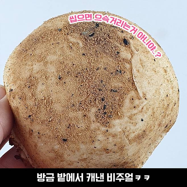 리얼함을 더욱 살려주는 이 가루들의 정체는 콩가루와 굵은 흑임자 가루라고 해요. 이 빵의 비주얼은 가루들이 전부 했다고 봐도 무방할 것 같아요ㅋㅋ