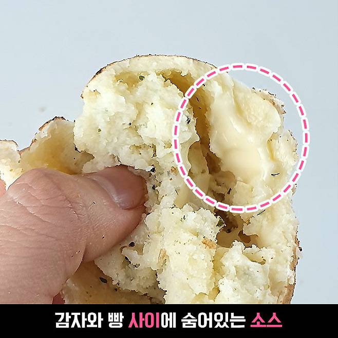 잘 살펴보니 빵과 감자 사이에 발라져있는 정체불명의 소스! 따로 먹어보아도 잘 모르겠어 홈페이지에도 찾아보았는데 기재되어 있지 않더라고요ㅠㅠ 자세히 설명드리고 싶었는데 죄송해요‧º·(˚ ˃̣̣̥⌓˂̣̣̥ )‧º·˚ 맛은 마요네즈? 크림치즈? 같은 맛에 짭짤한 맛이 가미된 것 같았어요. 혹시 무슨 소스인지 아시는 분이 계시면 댓글로 알려주세요!!