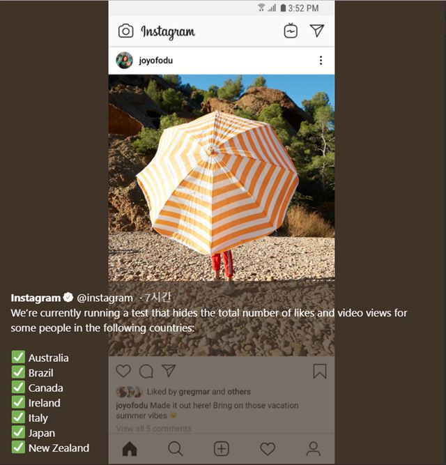 이번 모두 인구가 아주 큰 국가에 SNS를 열심히 활용하는 나라라는 특징이 있지. 이로써 총 12개국에 기반을 둔 일부 계정에서는 게시글의 ‘좋아요’ 숫자가 보이지 않게 된다.