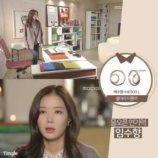 매니시한 재킷안에 쉬폰 소재의 패턴 블라우스 + 스키니 진을 코디한 임수향은 나선형 골드 이어링을 착용하여 한층 더 여성스러운 느낌의 오피스룩을 연출해 주었어요. 자켓과 스키니진은 편안한 캐주얼 룩을 살리면서도 오피스 룩으로도 적합한 아이템인데요. 활동성을 고려한다면 이 코디를 추천합니다!