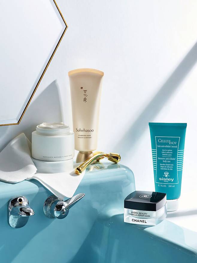 위부터 시계 방향으로_ Sulwhasoo옥용팩 묵은 각질을 제거하며 둥굴레 파우더와 금은화 추출물이 맑은 피부 톤을 살려주는 필오프 타입 팩. Estee Lauder 리-뉴트리브 얼티미트 페이셜 마사저 피부의 미세 순환에 도움을 주어 피부에 생기를 불어넣는다. Sisley 셀루리노브 인텐시브 안티-셀룰라이트 바디 케어 롱간 시드 추출물과 카페인 등의 성분이 늘어진 보디 피부에 탄력을 부여한다. Chanel 이드라 뷰티 까멜리아 리페어 마스크 까멜리아 알바 PFA 성분을 담은 보습 케어 밤. 건조하거나 붉어진 부위에 바르고 마사지하면 즉각 수분을 보충해 피부가 빠르게 진정된다. Suqqu 머스큘레이트 마사지 & 마스크 크림 쿠션감 있는 크리미한 텍스처가 마사지 효과를 높이고, 뭉친 얼굴 근육을 탄력 있게 풀어준다.