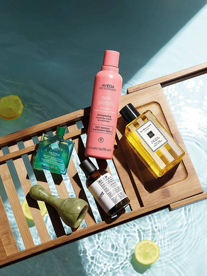 위부터 시계 방향으로_ Aveda 뉴트리플레니쉬™ 샴푸 라이트 모이스처 가벼운 질감으로 가늘고 건조한 모발에 수분과 영양을 공급한다. Jo Malone London 라임 바질 앤 만다린 배스 오일 천연 유연제를 함유해 피부를 진정시키고 수분을 공급한다. 향기로 공간을 채워 심신에 안정감을 준다. Le Labo 베이 19 마사지 앤 배스 퍼퓨밍 오일 묽은 포뮬러에 은은한 향을 담아 보디 피부에 부드럽게 롤링하기 쉽다. O.M 옥 괄사 음이온과 원적외선을 방출해 피부 톤 개선과 부기 완화에 도움을 주는 마사저. Rene Furterer 아스테라 프레쉬 두피 진정 세럼 페퍼민트 에센셜 오일이 열 오른 두피를 시원하게 케어하고 진정 작용과 함께 건조함으로 인한 가려움증을 완화한다.