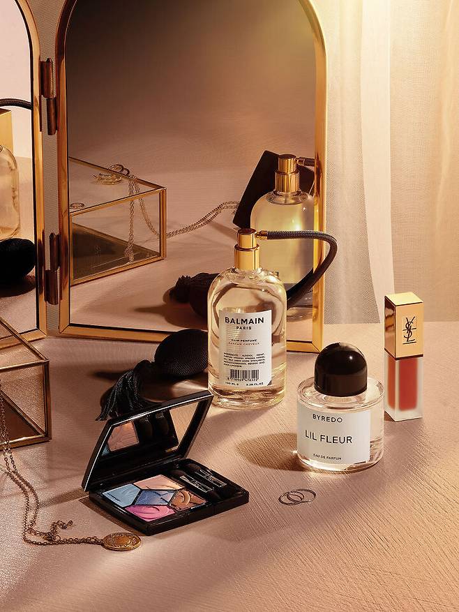 왼쪽부터 시계 방향으로_ Dior 5 꿀뢰르-컬러 게임 컬렉션 리미티드 에디션 #287 청량한 블루와 플럼 계열까지 다섯 가지 컬러로 구성한 아이섀도 팔레트. Balmain Hair 헤어 퍼퓸 브러시에 뿌린 후 빗질하면 모발에 은은한 향기와 함께 실크 단백질 등 영양을 공급한다. YSL Beauty 밀크티 컬렉션 따뚜아쥬 꾸뛰르 #39 한 번만 터치해도 톤 다운된 로즈 코럴 컬러로 입술을 물들일 수 있다. 밀착력이 뛰어나 오래도록 컬러가 유지되는 것도 장점. Byredo 릴 플레르 생기 있는 블랙커런트와 탠제린 향기가 크리스피한 다마스크 장미와 만난 싱그러운 플로럴 향수.