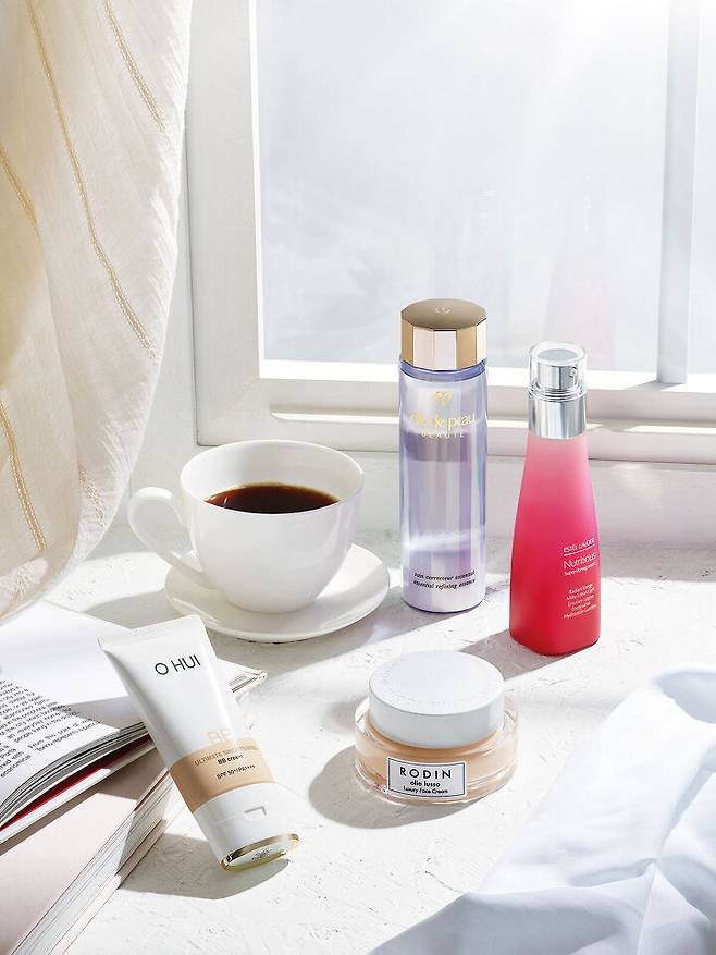 위부터 시계 방향으로_ Cle de Peau Beaute 에센셜 리파이닝 에센스 묵은 각질을 제거하고 피지 분비와 수분 손실을 억제해 거친 피부를 매끈하게 정돈해준다. Estee Lauder 뉴트리셔스 수퍼-포머그래니트 래디언트 에너지 밀키 로션라이트 석류의 풍부한 영양 성분이 피부를 정화하고 광채와 생기를 선사하는 데일리 밀키 로션. Rodin by net-a-porter 럭셔리 페이스 크림 자연 유래 에센셜 오일 블렌드의 영양이 피부를 유연하게 가꿔준다. 소량을 덜어 손끝에서 데운 후 펴 발라 흡수시킬 것. O Hui 얼티밋 브라이트닝 BB 크림 부드러운 크림 텍스처가 뭉침 없이 발려 매끈한 도자기 피부를 완성한다.