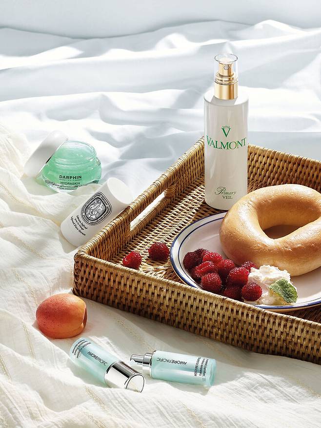 위부터 시계 방향으로_ Valmont 프라이머리 베일 토너 사용 후 넉넉한 양을 분사하면 피부 장벽을 강화하며 편안한 피부 컨디션을 유지해준다. Amorepacific 모이스춰 플럼핑 컨센트레이트 앰플 왕대나무 진액과 수액을 블렌딩한 뱀부 넥타 성분이 수분으로 피부를 촘촘히 채운다. Diptyque 인퓨즈드 페이스 세럼 고체화한 세럼 텍스처가 피부에 닿으면서 상쾌한 로션 제형으로 변한다. 재스민과 호호바 왁스 성분이 매끄럽고 윤기 나는 피부로 가꾼다. Darphin 하이드라 쿨링 하이드레이팅 젤 마스크 버블 형태의 젤 텍스처를 덜어 젖은 손가락으로 마사지한 후 씻어내면 피부 수분과 활력이 24시간 동안 유지된다.