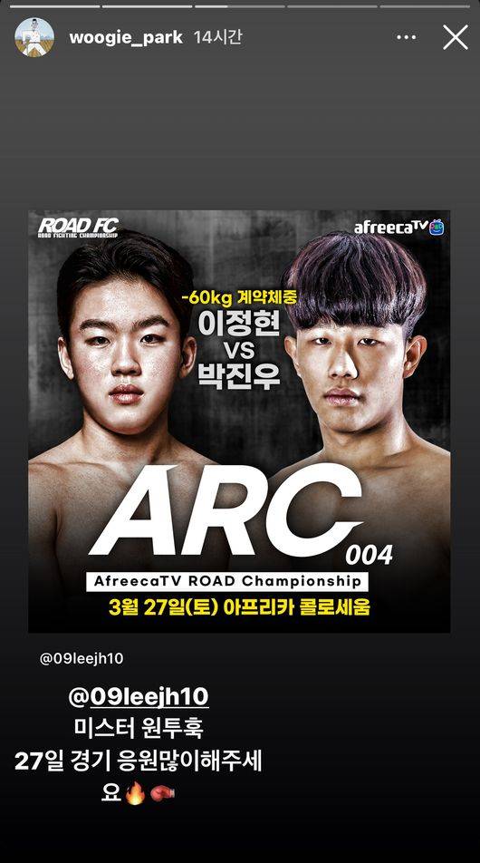 [OSEN=우충원 기자] 힙합 프로듀서 우기가 도전자였던 ROAD FC 파이터 이정현(19, 싸비MMA)의 승리를 기원했다.