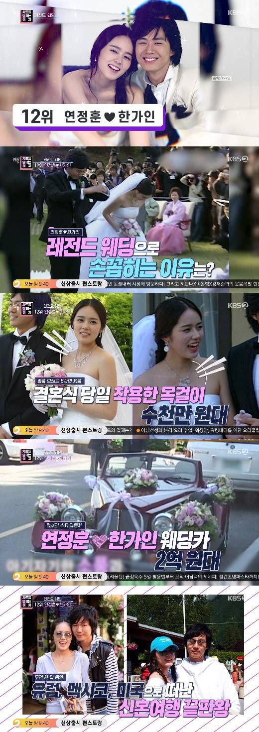 이날 12위에 연정훈, 한가인 부부가 이름을 올렸다. 지난 2005년 4월 결혼한 연정훈, 한가인 부부. 두 사람이 결혼식을 올린 곳은 최소 예식 비용만 5천만원이라고. 결혼식을 위해 동원된 직원은 500여명.