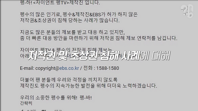 펭수를 그저 캐릭터로만 여긴다 해도 저작권 때문에 그러면 안 되는 거고. 펭격을 존중해주셨으면 좋겠다.