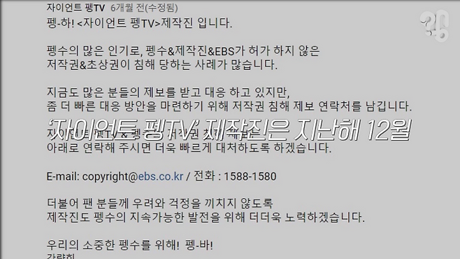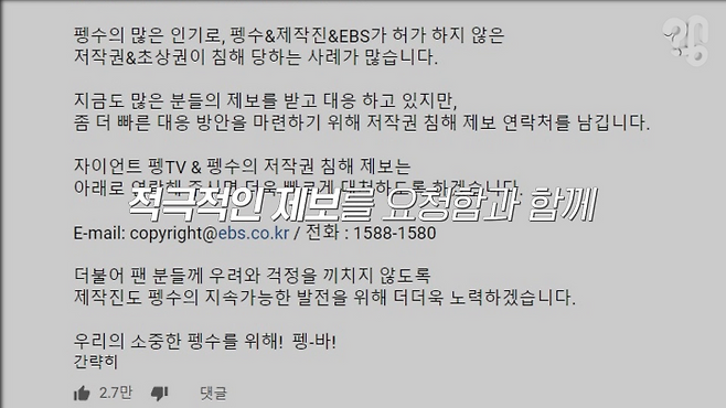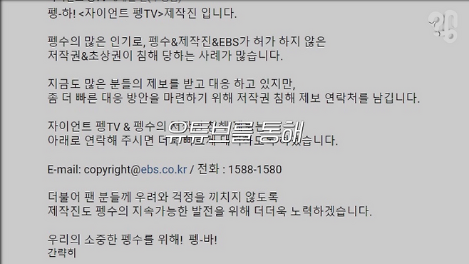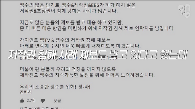 펭수를 그저 캐릭터로만 여긴다 해도 저작권 때문에 그러면 안 되는 거고. 펭격을 존중해주셨으면 좋겠다.