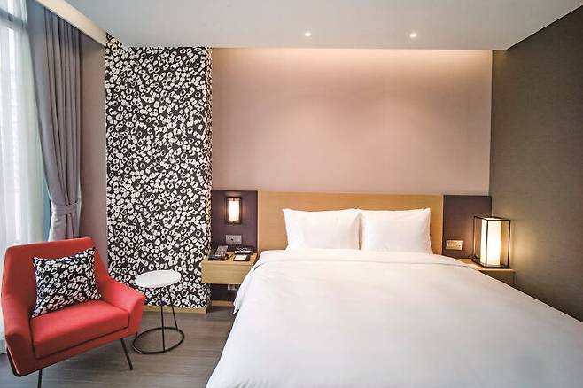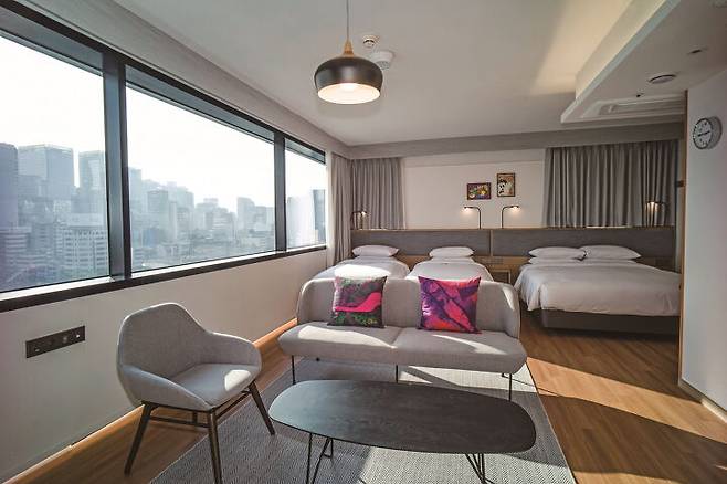 객실로 들어갔다. 지상 16층, 지하 3층 규모의 호텔에는 스탠더드 객실 137개와 스위트룸 2개가 있다. 스위트룸은 장기 투숙객 및 다인이 이용하기 편리하도록 쿼드 룸, 트리플 룸으로 구성했다. 내추럴하고 깔끔한 인 테리어이면서도 밀레니얼이 좋아할 만한 아이템들을 포인트로 배치했다. 유머러스한 그림 액자, 전 세계 목시에서 공통으로 사용하는 레트로한 디자인의 전화기와 목시의 시그니처 컬러인 분홍색 전기주전자와 휴지통, 소품 하나하나가 예사롭지 않았다. 옷장 대신 철제 행어를 벽에 설치하거나 보조 테이블과 포터블 체어를 걸어놓는 등 넓지 않은 객실에 맞춰 가구 배치를 효율적으로 한 것 또한 마음에 들었다.