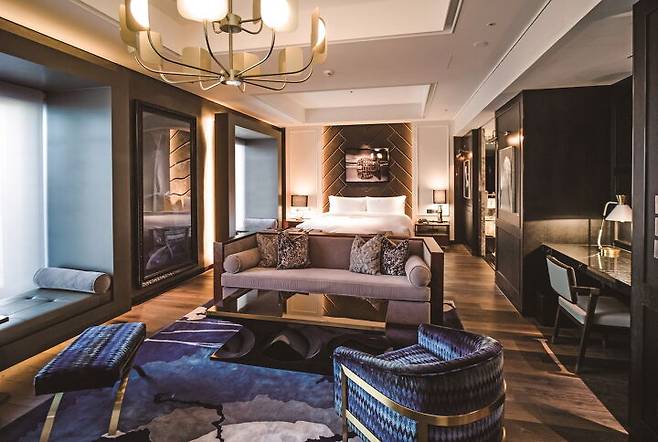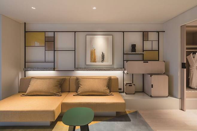 눈으로 볼 수 있는 한국의 콘텐츠는 ‘조각보’다. 인테리어 디렉팅을 맡은 네덜란드 크리에이티브 디자인팀 피트 분Piet Boon은 자투리 천을 이어 붙여 만드는 조각보에서 영감을 얻었다고 밝혔다. 그는 객실(객실은 일반 객실과 스위트룸, 호스피털리티 스위트까지 총 241개가 있다)과 다이닝에서 그 콘셉트를 명확하게 풀어내고 있다. 벽지나 가구부터 슬리퍼 같은 작은 소품까지 따뜻한 느낌의 노란색, 하늘색, 초록색 등 한국적인 색감을 주로 사용했다. 조각보처럼 경계를 나눈 서랍장이나 자개 장식 수납함 등의 디테일도 재미있다.