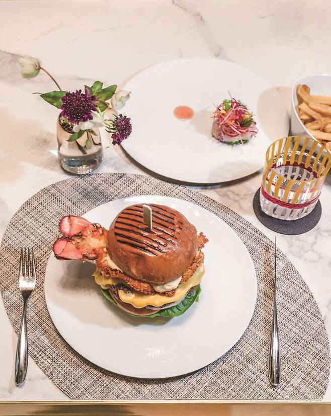 짧은 산책 후 허기를 달래기 위해 다시 3층을 찾았다. 새라새Serasé 레스토랑에서 오후 6시까지 제공하는 애프터눈티와 라운지 & 바 새라새Lounge & Bar Serasé 의 메인 디시 사이에서 고민하다 결국 후자로 마음이 기울었다. 꼬리까지 튀긴 랍스터를 소고기 패티 위에 얹고 체더치즈로 마무리한 한우 & 바닷가재 버거는 과연 시그니처 메뉴답게 탁월한 선택이었다. 배도 채우고 칵테일도 한잔 마셨지만, 아직 할 일이 남았다. 아트파라디소의 정체성인 아트워크 감상만큼은 놓칠 수 없다. 수많은 작품 중 기억에 남는 것은 바 위에 자리한 호주 작가 알렉시아 싱클레어의 <레이디 저스티스>와 1층 라운지에 전시된 백남준 작가의 작품 <히치콕드>.