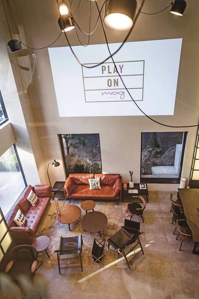 마케팅 책임자 에이미 김은 ‘목시 호텔은 기존의 틀을 벗어나 투숙객끼리 섞여 쉽게 소통하고 즐겁게 미팅이나 업무를 할 수 있는 부티크 호텔의 감성을 갖고 있어요. 투숙객이 모두 함께 즐기는 참여형 호텔을 지향하고 있습니다”라고 말한다. 높은 층고의 공간에 놓인 멋스러운 가구, 흰 벽에 쏘아지는 영상, 인더스트리얼하면서도 빈티지한 분위기로 꾸며진 로비에서부터 젊은 감각이 느껴진다. 호텔의 콘셉트를 반영한 듯, 1층 로비 플레이 목시PLAY MOXY에는 테이블 풋볼 기구와 보드게임 기구가 놓여 있다.