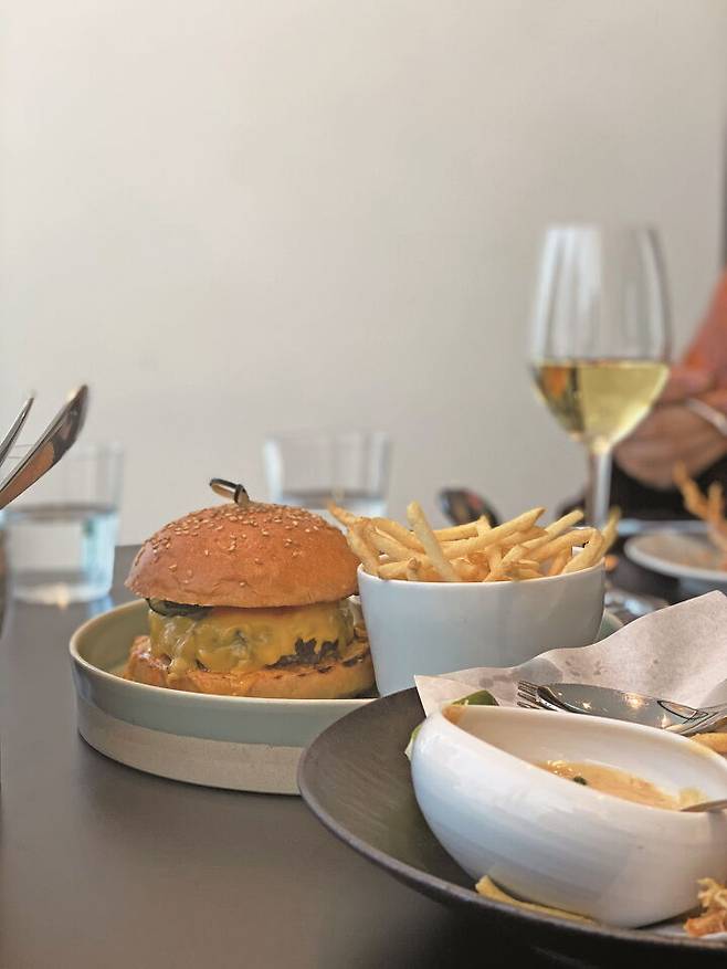 늦은 오전에 일어나 여태 한 끼도 안 먹었다는 사실을 깨닫자마자 허기가 몰려왔다. 서둘러 2층의 다이닝 공간, 조각보로 향했다(로비에서는 중앙 계단으로 연결되는데, 벌써부터 포토 존으로 정평이 났으니 놓치지 말 것). 안다즈의 핵심 공간을 꼽으라면 단연 여기다. 조각보는 크게 티와 와인, 간단한 식사를 준비하는 ‘조각보-롱하우스’와 그릴 요리를 선보이는 ‘조각보-미들하우스’, 오픈 키친에서 요리하는 ‘조각보사우스 하우스’로 나뉘어 있는데 세 키친을 두고 고민하지 않아도 된다. 각각의 키친이 경계가 없어서 주문이 자유롭다. 코스 메뉴도 있지만 조각보는 단품 메뉴에 좀 더 주력하는 듯했다. 호텔 다이닝 치고는 매우 합리적인 가격도 마음에 들었다.