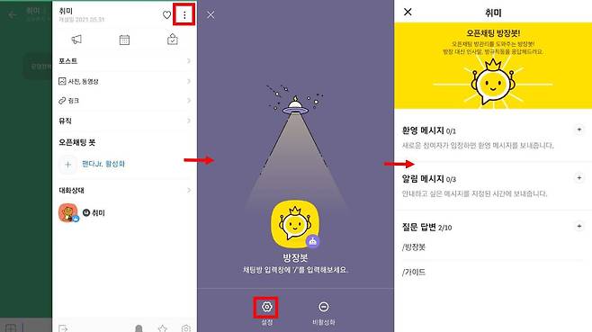방장은 방 관리를 위해서 방장봇으로 ‘환영메시지’나 ‘알림메시지’를 설정할 수도 있다. 환영메시지 기능을 켜면, 새로운 사람이 방에 입장할 때 환영메시지가 자동으로 전송된다. 알림메시지를 켜면 지정된 시간에 특정 메시지를 보낼 수 있다. 이런 기능 덕분에 새로운 유저가 방에 입장할 때마다, 방장이 규칙을 일일이 설명할 필요가 없는 것이다.