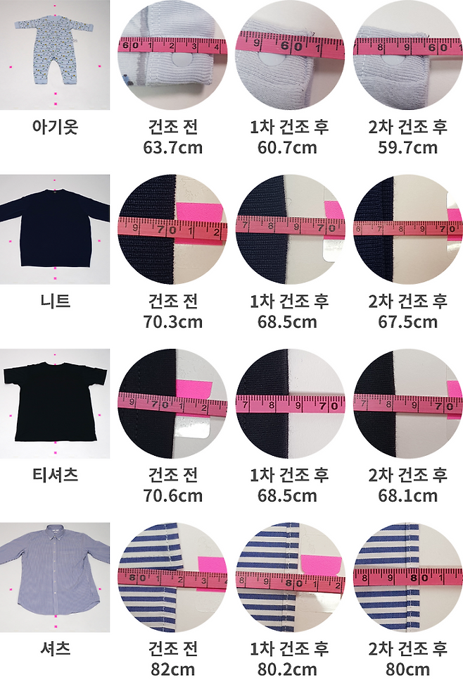 모든 건조기는 따뜻하게 데워진 공기로 건조하기 때문에 열과 마찰에 의한 수축은 무조건 발생할 수 밖에 없습니다.