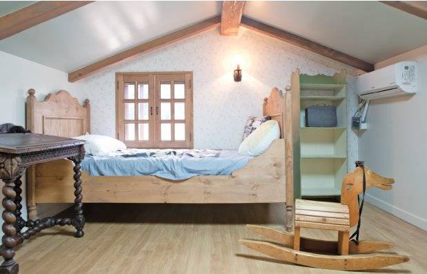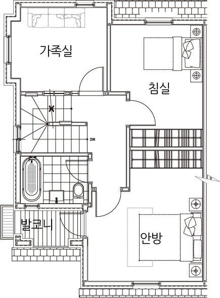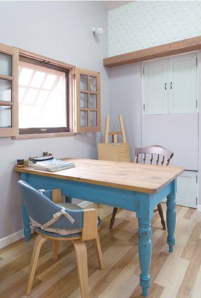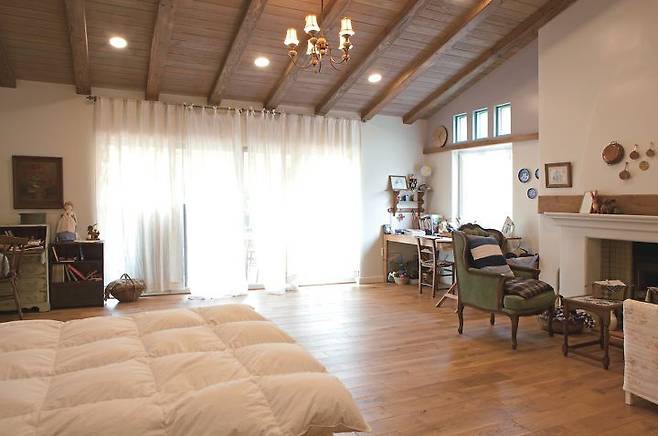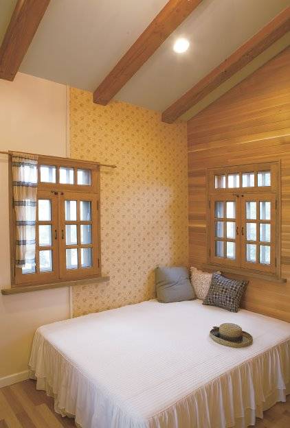 1층과 달리 사적인 공간이 주를 이루는 2층은 가족실, 침실, 욕실, 안방, 발코니를 배치했다. 가족이 함께하는 시간을 늘리기 위해 배치한 가족실은 별도의 문을 설치하지 않고 침실과 이어지게 해 평수보다 넓어 보이는 효과를 냈다. 그뿐만 아니라 2층에서 이어지는 다락은 또 하나의 방처럼 아기자기한 소품들로 꾸며 어린 자녀를 둔 가족에게 안성맞춤 공간으로 재탄생했다.