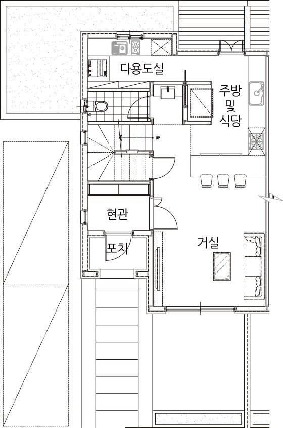 이어 복층으로 구성한 내부는 1층을 거실, 주방/식당, 다용도실로 단출하게 꾸몄다. 주방/식당은 거실과 함께 개방감과 확장감이 느껴지도록 탁 트이게 꾸미고, 원목 자재를 사용해 따스하면서도 고풍스러운 분위기를 더했다.