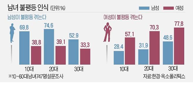 특히 20~30대 남녀는 다른 세대에 비해 유독 스스로를 ‘성차별 피해자’로 여기는 것으로 나타났다. ‘여성이 불평등을 겪는가’란 질문에 20대 여성은 70.3% 동의했지만, 20대 남성은 31.9%만 수긍했다. 반대로 ‘남성이 불평등을 겪는가’란 물음에 20~30대 남성은 각각 74.6%, 52.9% 공감했다. 이 질문에 대한 20·30대 여성 동의율은 39.1%, 33.3%에 그쳤다.