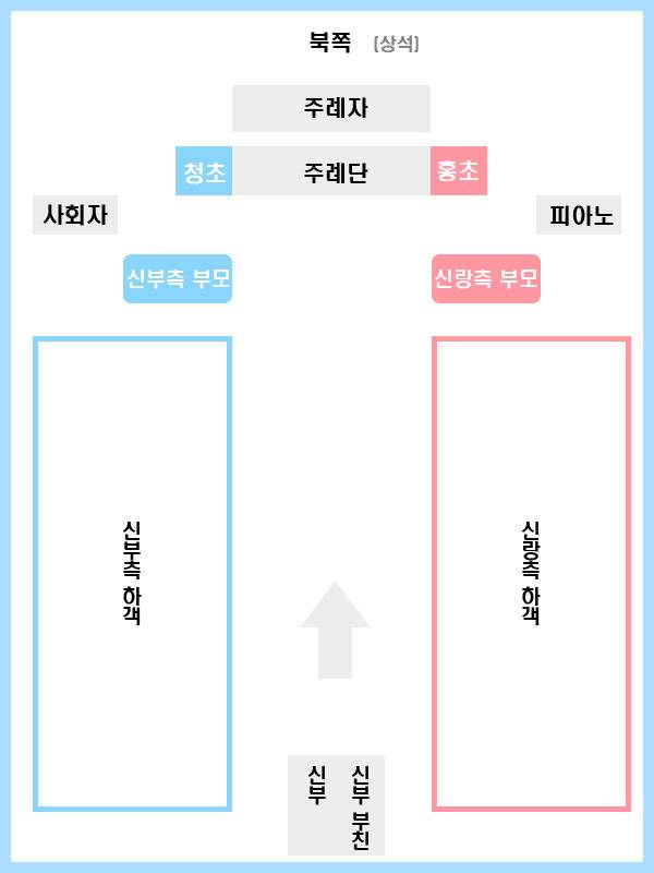 전통 예법에서는 상석을 기준으로하여 방위를 정했고, 혼례에서는 주례단이 그 기준이 된다고 해요!