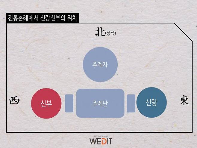 전통 예법에서는 상석을 기준으로하여 방위를 정했고, 혼례에서는 주례단이 그 기준이 된다고 해요!