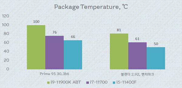 한편, 코어 i5-11400F는 코어가 8개에서 6개로 줄어든데다, 동작 클럭도 상위 제품들보다 낮은 만큼 소비전력과 발열 특성도 우수하다. 인텔 XTU 기준으로 측정한 발열 특성은 코어 i7-11700 대비 약 10℃ 가량 낮고, 소비 전력도 최대 50W나 낮은 것으로 측정되었다.