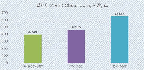 CPU 성능 비교를 위해 자주 쓰이는 시네벤치의 최신 버전과 블랜더의 랜더링 성능 테스트 역시 멀티 코어 활용도가 높은 프로그램인데, 이들 테스트 결과를 보면 코어 i5-11400은 역시나 상위 모델 대비 아쉬운 모습을 보여준다.