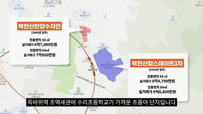 이중 불광동 북한산힐스테이트3차는 독바위역 초역세권에 수리초등학교가 가까운 초품아 단지입니다. 최근 전용면적 59㎡가 8억4,700만원, 84㎡가 9억8,800만원에 거래됐습니다. 독바위역 북측에 있는 북한산한양수자인은 59㎡가 6억7,000만원, 84㎡가 7억500만원에 거래됐고요.