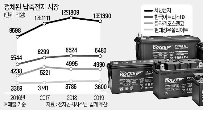 국내 납축전지업계를 대표하는 세방전지, 한국아트라스BX, 클라리오스델코, 현대성우쏠라이트 등 4대 업체의 매출은 최근 4~5년 동안 정체되거나 소폭 감소했다. 납축전지업계에 따르면 이들을 비롯한 국내 10개 배터리업체의 전체 매출은 2016년 2조5000억원에서 2017년 2조9000억원 규모로 늘었지만 2018~2019년에는 3조원 수준에서 정체됐다. 코로나19가 확산됐던 지난해에는 매출이 전년 대비 소폭 감소했을 것으로 업계는 추산하고 있다.