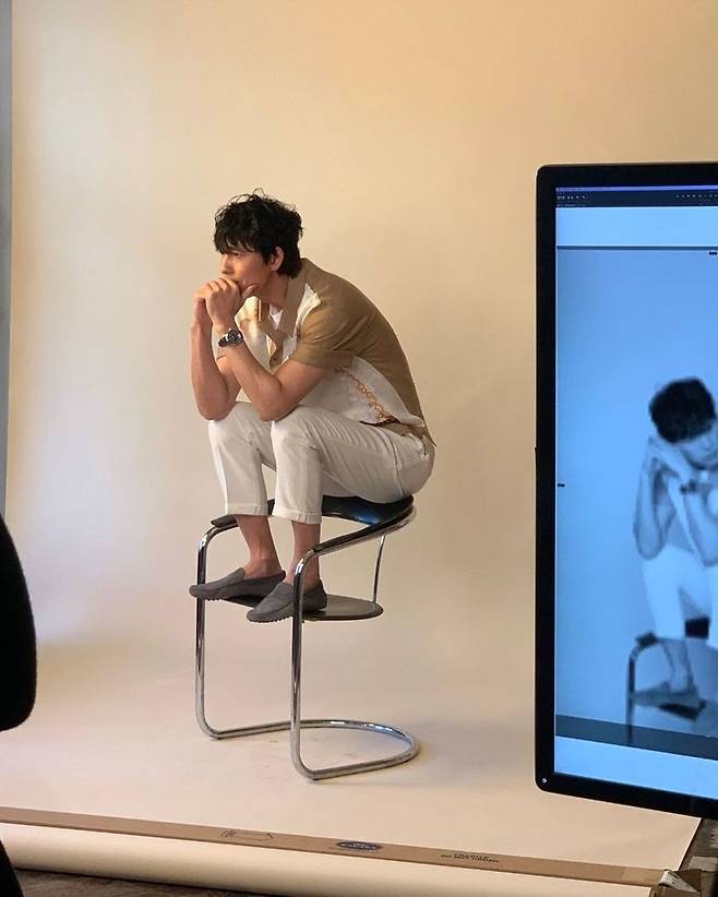 공개된 사진 속 정우성은 의자 허리받침대 위에 앉아 있다. 양 손으로 턱을 괴고 있는 모습은 화보를 연상케 하고 있다.