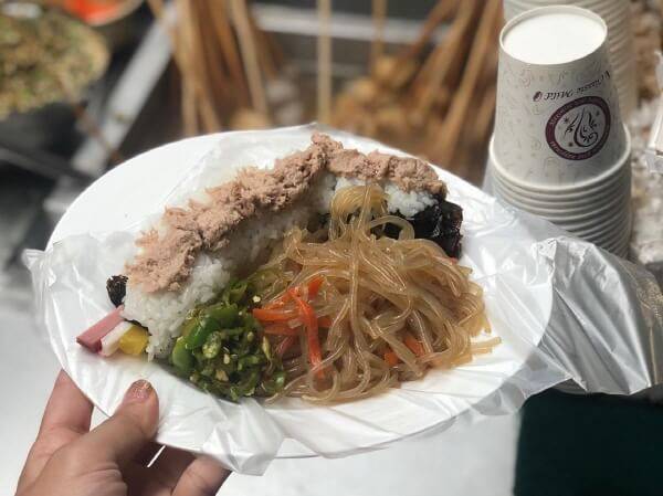 맛있는 것 많기로 유명한 광장시장에서도 모르는 이가 드물다는 김밥 맛집이다. 비교적 저렴한 가격과 밥이 재료를 품고 있는 독특함으로 꾸준히 사람들이 모이는 곳. 참치, 단무지, 햄, 어묵, 치즈, 맛살 등 흔한 재료지만 다진 청양고추를 올려 먹으면 매콤하고 고소한 맛에 반하게 된다고. 잡채 김밥은 오전 11시부터 주문이 가능하다. 접시 위에 누드김밥과 잡채가 함께 나오는 먹음직스러운 비주얼이다. 소박하지만 정겨운 맛으로 중독성이 있다.