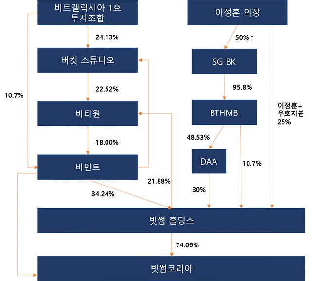 단독으로는 ‘비덴트’가 34%의 대주주이나, 이 의장은 자신이 최대주주인 싱가포르 법인 ‘SG GK’로부터 내려오는 지배 구조를 통해 ‘DAA(30%)+BTHMB홀딩스(10.7%)+우호지분(25%)’을 더한 65%의 압도적인 지분율로 ‘빗썸’의 실소유권을 장악하고 있다. ‘34% vs 65%’이니 애초에 경영권 싸움은 성립조차 되지 않았던 셈. 앞서 비덴트의 최대주주사인 비티원 이사진 선임을 두고도 김재욱 전 대표와 이정훈 의장 측이 공방을 벌여 해당 건은 김 전 대표가 승리했으나, 역시 실질적인 의미는 없었다.