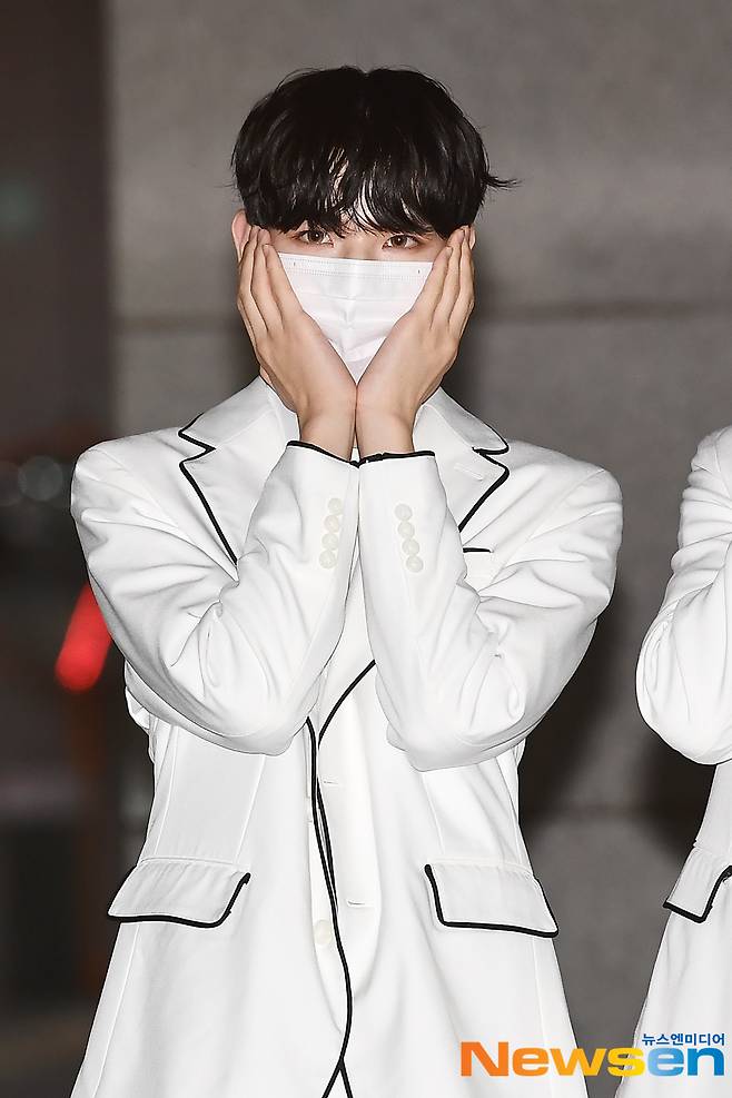 이펙스(EPEX) 멤버 뮤가 방송국으로 들어서고 있다.