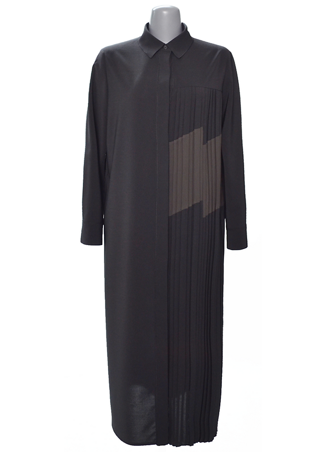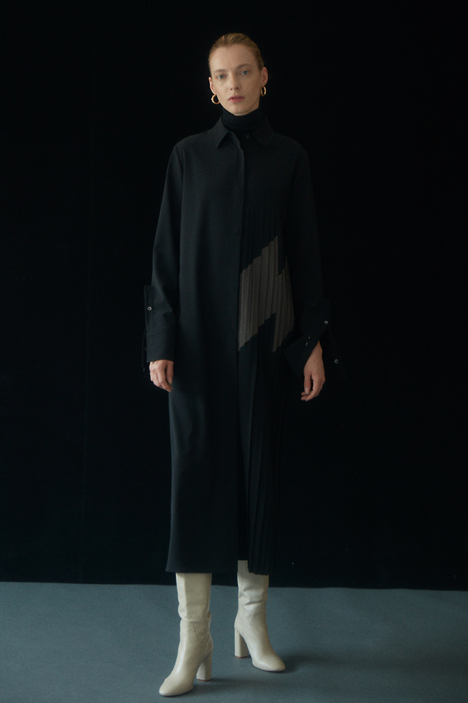 신축성 좋은 폴리 소재의 셔츠형 롱 원피스로, 한쪽에만 주름을 잡은 언밸런스 스타일로 멋스러우면서 실용성이 뛰어난 제품이다. 김희애처럼 숄과 함께 매치해 우아한 원피스 룩으로 즐기거나, 가볍게 걸칠 수 있는 아우터웨어 등 다양하게 연출할 수 있다.