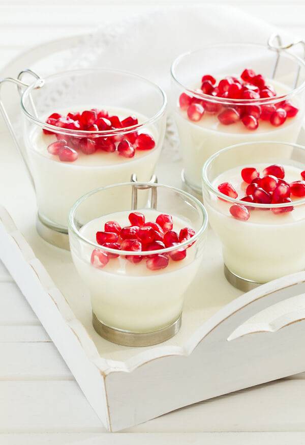 판나코타는 이탈리아식 푸딩으로 만들기도 간편하고, 어떤 과일을 곁들여도 잘 어울린다. 먼저 젤라틴을 물에 넣고 불린다. 팬에 생크림 200mL, 우유250mL, 설탕 2큰술을 넣고 데운다. 팬에 불린 젤라틴을 중탕으로 녹여서 넣는다. 코엔트로 1작은술과 바닐라 익스트랙 약간 넣고 컵에 나누어 담는다. 냉장실에서 4~5시간 정도 굳힌다. 굳으면 석류알을 발라내 듬뿍 올린다. 시럽을 약간 뿌리고 민트잎을 올려 마무리한다.