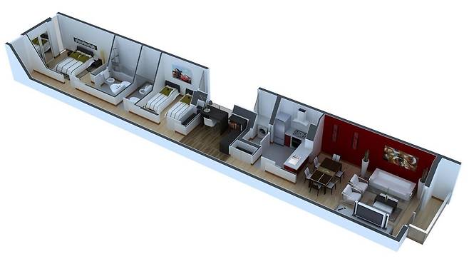 넓다! 공간이 넉넉하다는 점은 레일로드 아파트의 가장 큰 장점입니다. 이상한 구조때문이긴 하지만 비슷한 가격의 매물들에 비해 훨씬 넓은 평수의 아파트를 구할 수 있는데요. 복도를 없애고 더 큰 방을 만들 수도 있어 한 평 한 평이 소중한 이 도시에서 나름 큰 효용성을 자랑합니다.