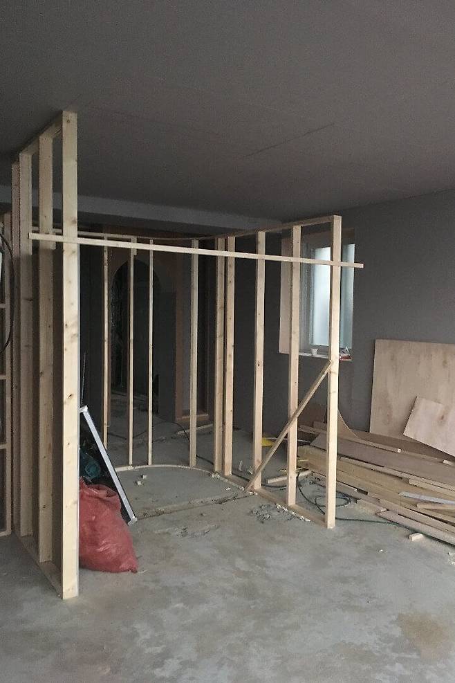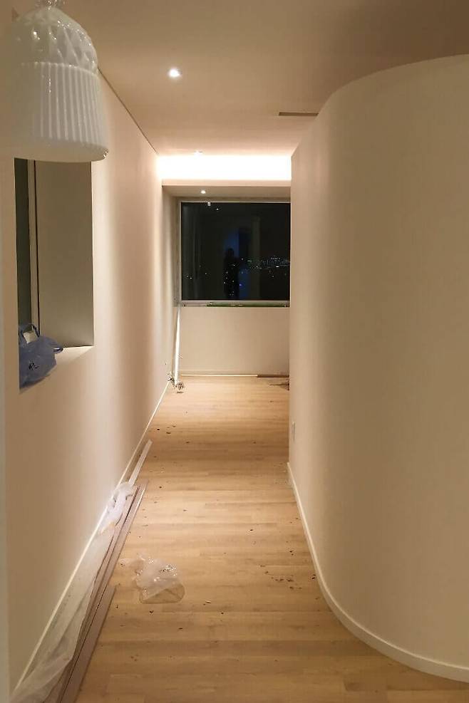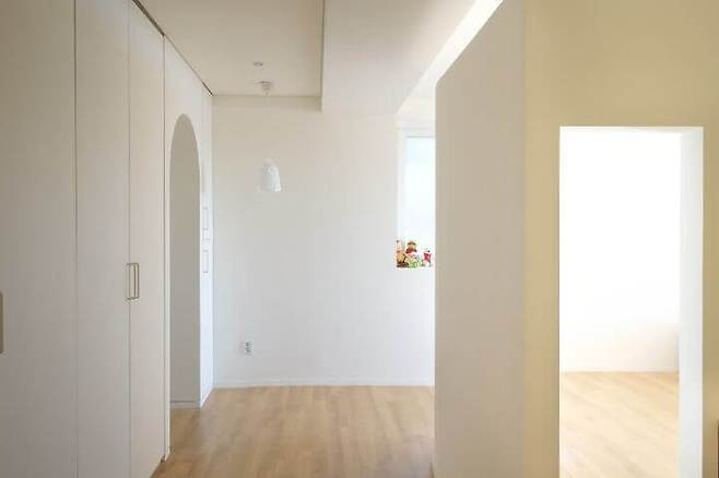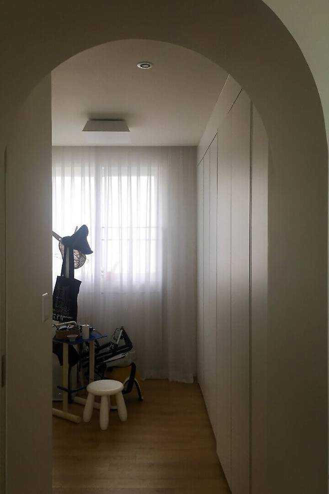 완공 후의 모습입니다. 현관에서 서서 바라본 모습이에요. 왼쪽으로는 아치를 만들었는데 사실 특별한 이유는 없어요. 저희 집에 방이라고는 왼쪽에 있는 게 다 여서 포인트가 되면 좋을 것 같았어요. :) 왼쪽에 붙박이는 저희 집에서 창고를 담당하고 있어요. 이 붙박이가 현관까지 이어지는데 현관 바로 앞에 있는 건 신발장 역할을 합니다.